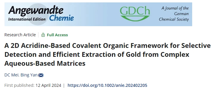金作为最重要的金属之一,由于其稳定的物理化学性质,优异的导电性、导热性和延展性,不仅在珠宝行业,还在电子、航空航天和化学催化等重要领域都具有不可替代的地位。此外,电子废水的大量排放,给生态环境带来了巨大的威胁。目前,电化学检测、荧光传感、离子交换和吸附等技术已经被广泛地应用于金离子的检测和提取。荧光传感和吸附凭借其成本低廉和操作简单等优势在实际应用中展现出巨大的潜力。而目前报道的大部分材料只能实现传感或吸附单一功能。近日,yl9193永利集团闫冰教授团队着眼于以上问题,合成了一例亚胺键连接的吖啶基共价有机框架(COF)材料,该材料能够作为新型探针实现对金离子的选择性荧光传感、比色传感和高效的提取,相关研究成果 “A 2D Acridine-Based Covalent Organic Framework for Selective Detection and Efficient Extraction of Gold from Complex Aqueous-Based Matrices” 在线发表于化学领域国际知名期刊《德国应用化学》(Angewandte Chemie International Edition)。