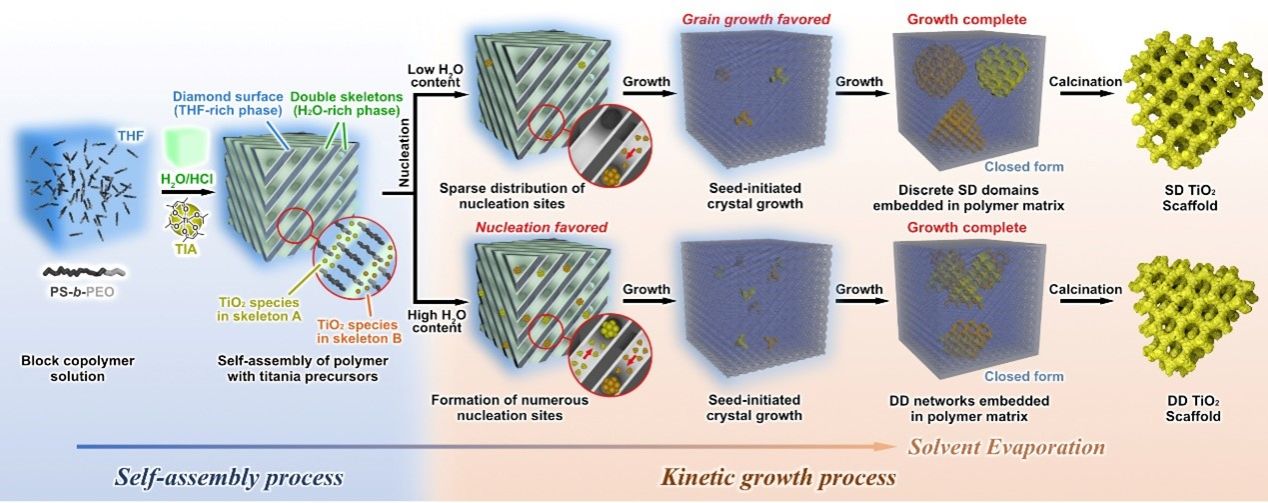 在这项研究中,巧妙地将热力学控制和动力学控制相结合,首先由聚环氧乙烷-b-聚苯乙烯(PEO-b-PS)共聚物在四氢呋喃与盐酸的混合溶剂中与TiO2前驱体双乙酰丙酮基二异丙基钛酸酯协同自组装,疏水性的PS嵌段形成平衡态金刚石极小曲面结构基质,将空间分隔为两个相互穿插但不相交的PEO网络。在此过程中,通过盐酸添加量可以有效控制TiO2前驱体在PEO端水解缩聚动力学过程。当TiO2成核数量有限时,成核位点在整个聚合物基质中独立分散。随着溶剂蒸发,TiO2低聚物在成核位点处富集并生长,形成独立的SD结构域。最后经煅烧去除聚合物模板即可得到SD结构锐钛矿TiO2骨架。