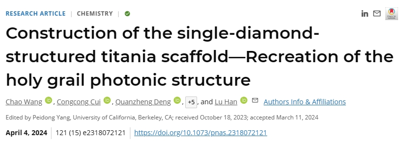 近日,我院韩璐教授团队通过在自组装过程中引入动力学和热力学的双重协同调控作用,实现了一步法对这种热力学亚稳态SD结构的高效制备,相关研究成果“Construction of the single-diamond-structured titania scaffold—Recreation of the holy grail photonic structure”(单金刚石结构二氧化钛骨架的构建——再现“圣杯”光子结构)发表于国际权威学术刊物《美国科学院院刊》(PNAS)。