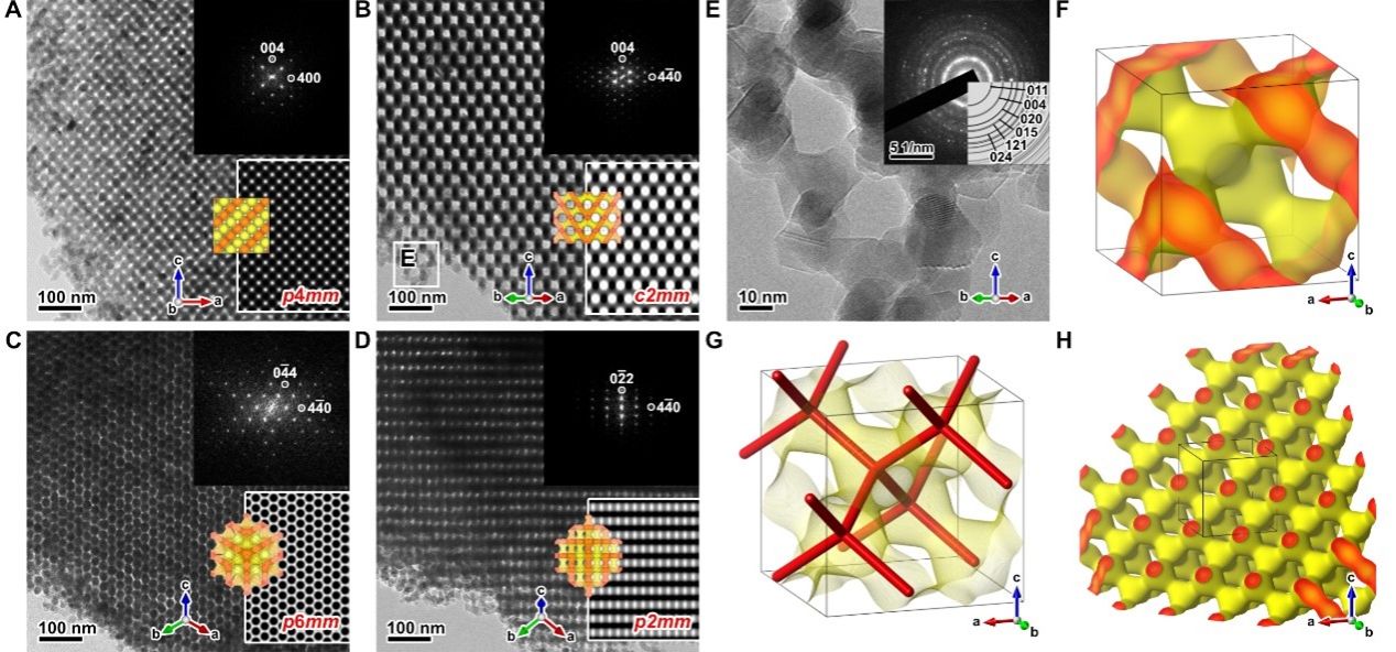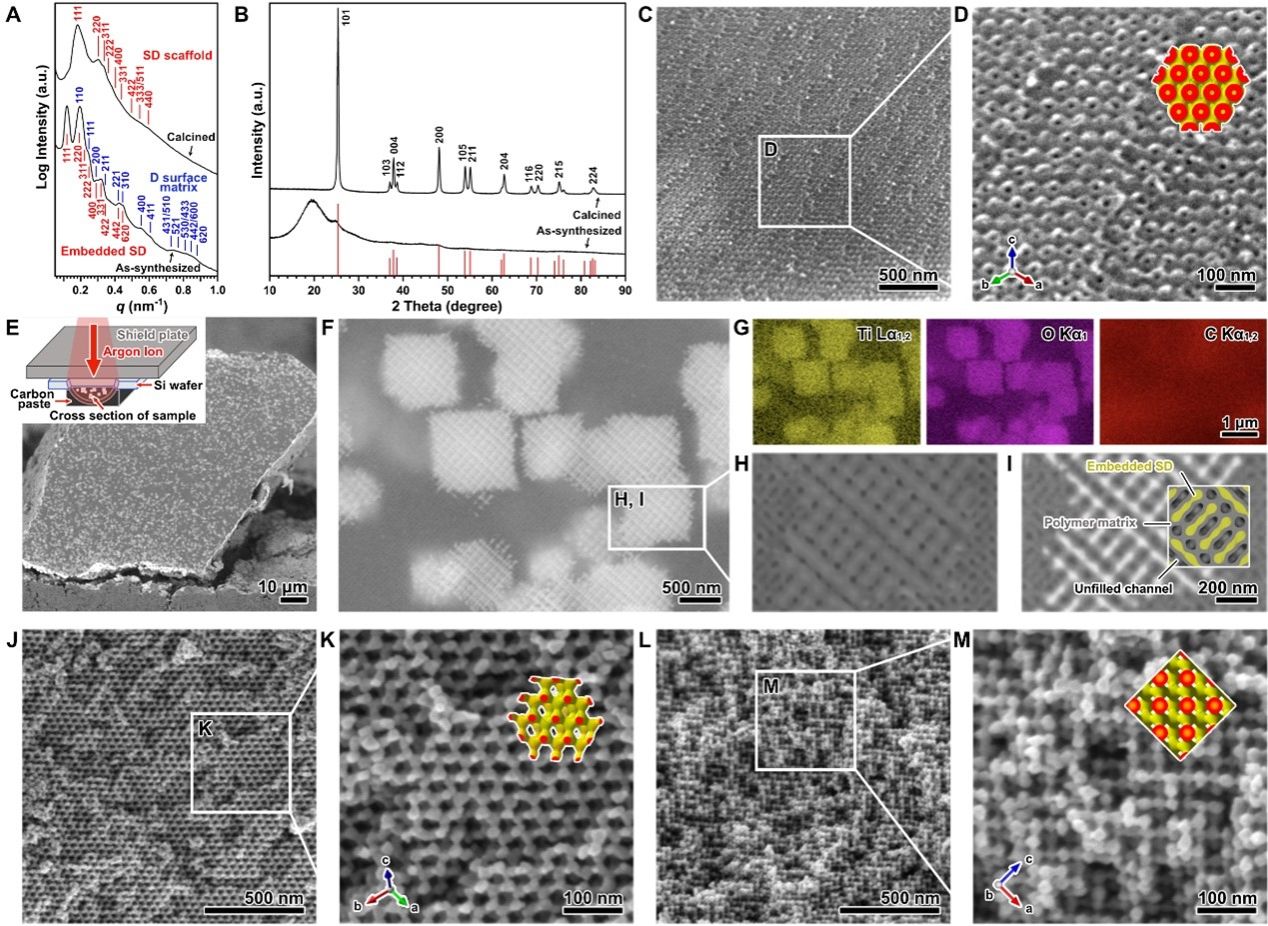 小角X射线散射和广角X射线衍射结果(图2A和2B)表明了样品具有高度有序的SD介观结构以及锐钛矿晶型。扫描电镜图像显示了焙烧前聚合物所形成的金刚石极小曲面(图2C和2D);通过氩离子束切割样品并对其横截面进行背散射电子成像和元素分析验证了SD TiO2骨架嵌入在聚合物基质中并作为独立晶畴存在(图2E-G)。高分辨率二次电子照片和背散射照片进一步确认了TiO2仅填充了聚合物基质中的一套孔道(图2H和2I)。经过焙烧,聚合物基质被去除,样品显示出四连接的纯相SD骨架结构(图2J-M)。