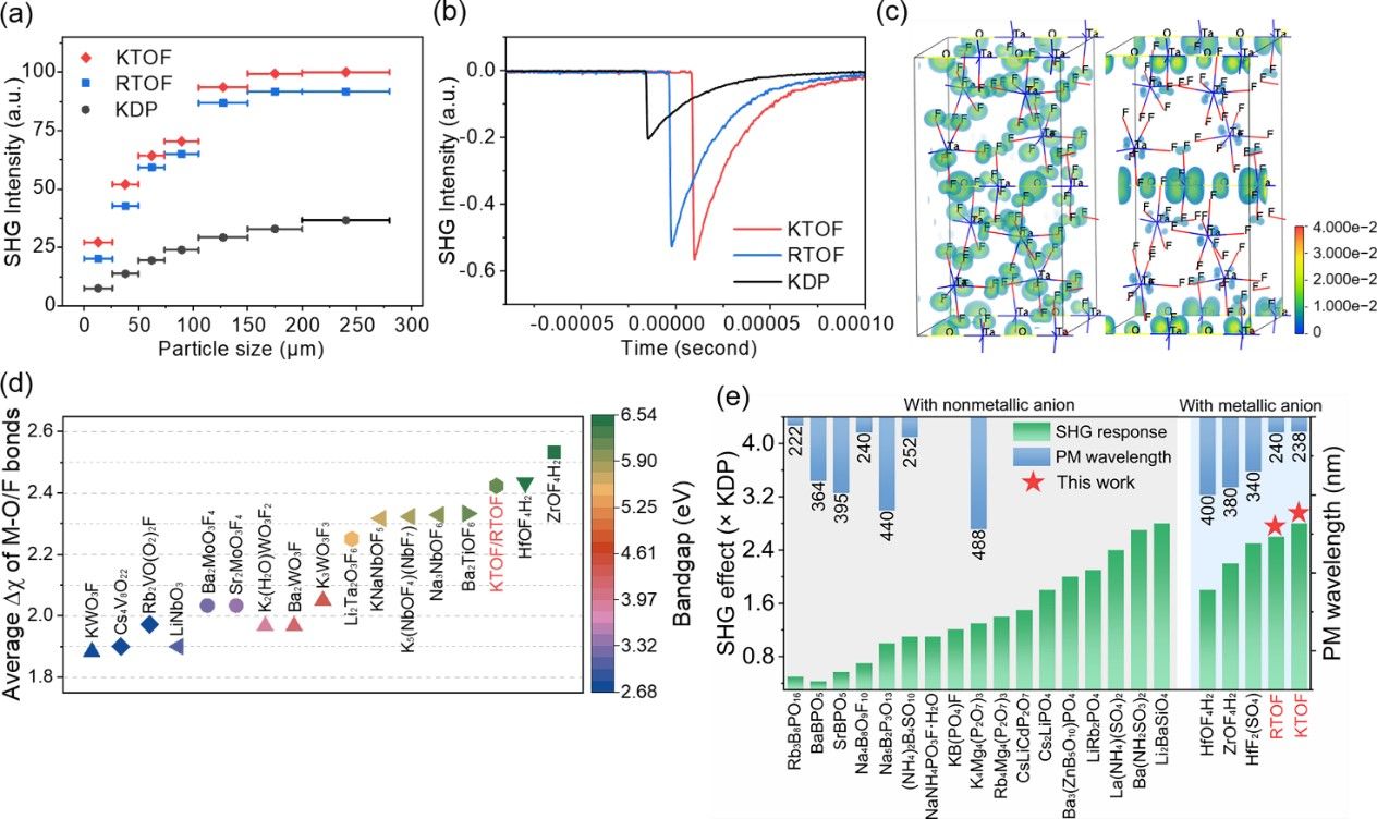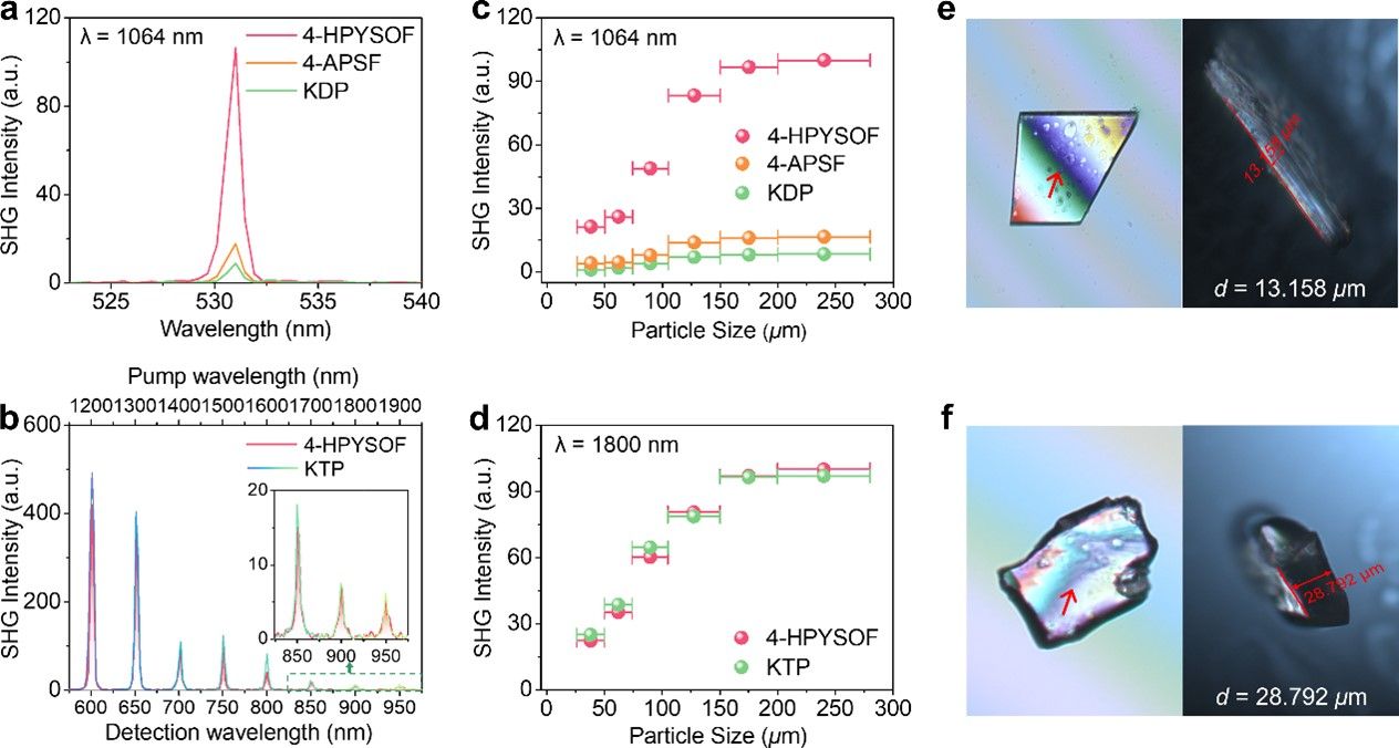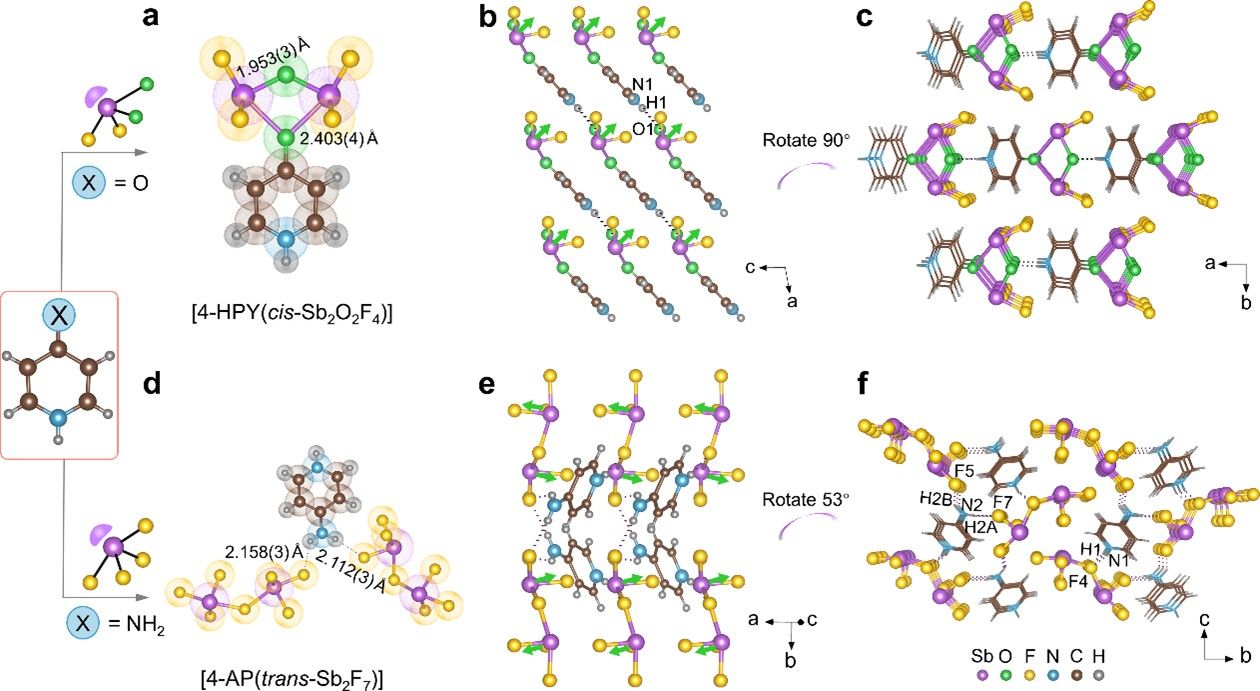 研究团队还运用单晶结构X射线衍射分析结合第一性原理理论进行模拟计算,深入探讨并阐明了4-HPYSOF可实现强倍频效应和大双折射率可归因于由极化离子键控制的顺式锑基二聚体[4-HPY(cis-Sb2O2F4)]的一致极化取向。实验研究显示,相较于由反式锑基二聚体[4-AP(trans-Sb2F7)] (该二聚体由氢键控制)组成的晶体材料4-APSF,4-HPYSOF晶体在可见光(12 × KDP @ 1200 nm)和红外光(1.0 × KTP @ 1800 nm)区域均表现出强的二次谐波响应,同时具有足够大的双折射(0.513 @ 546 nm)和短的紫外吸收截止边(270 nm)。该项研究对于创新研制新型高性能紫外光学倍频晶体具有极为重要的科学意义和示范作用。
