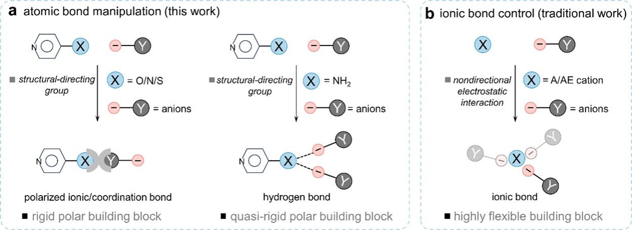 非线性光学晶体因其独特的频率转换功能,是实现难以获得(深)紫外激光输出的关键材料,在高分辨率显微镜成像、精密机械制造、光刻技术和光通信等光学和光电领域具有重大的实际应用需求。目前商业化的非线性光学晶体包括β-BaB2O4 (BBO),KH2PO4 (KDP),KTiOPO4 (KTP)等。应用新颖光学活性基元是研创紫外非线性光学晶体材料的传统方法之一。然而,光学活性基元间的复杂键合作用使得构成材料的一种或多种光学活性基元难以实现最佳有序组装集合,从而导致研制的材料难以达成倍频效应、光学透过窗口、光学带隙、双折射率等光学性能同步优化增益。因此,探索设计合成紫外非线性光学晶体是当前高性能光学材料、现代光通讯等领域的一个极富挑战的科学与技术难题。