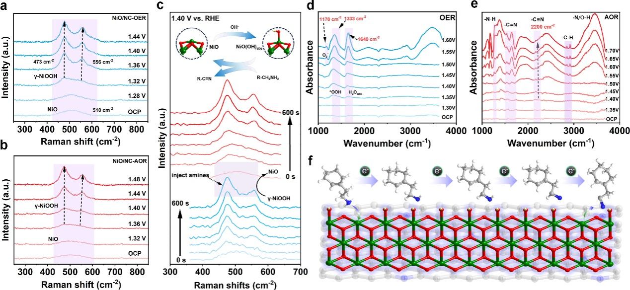 在不添加伯胺分子的体系中,原位拉曼显示在1.32 V vs. RHE下观测到了明显的γ-NiOOH特征峰。值得注意的是,该特征峰在添加伯胺分子的体系中延迟到了1.40 V vs. RHE,这证明了γ-NiOOH是伯胺分子氧化的主要活性物种。在较低电位下,原位产生的少量γ-NiOOH被伯胺分子快速消耗,出现了特征峰延迟现象。原位傅里叶变换红外光谱检测伯胺氧化到腈的反应过程,其中1.40 V vs. RHE处出现在2200 cm-2处的尖峰可以视为与-C≡N键的特征吸收峰。