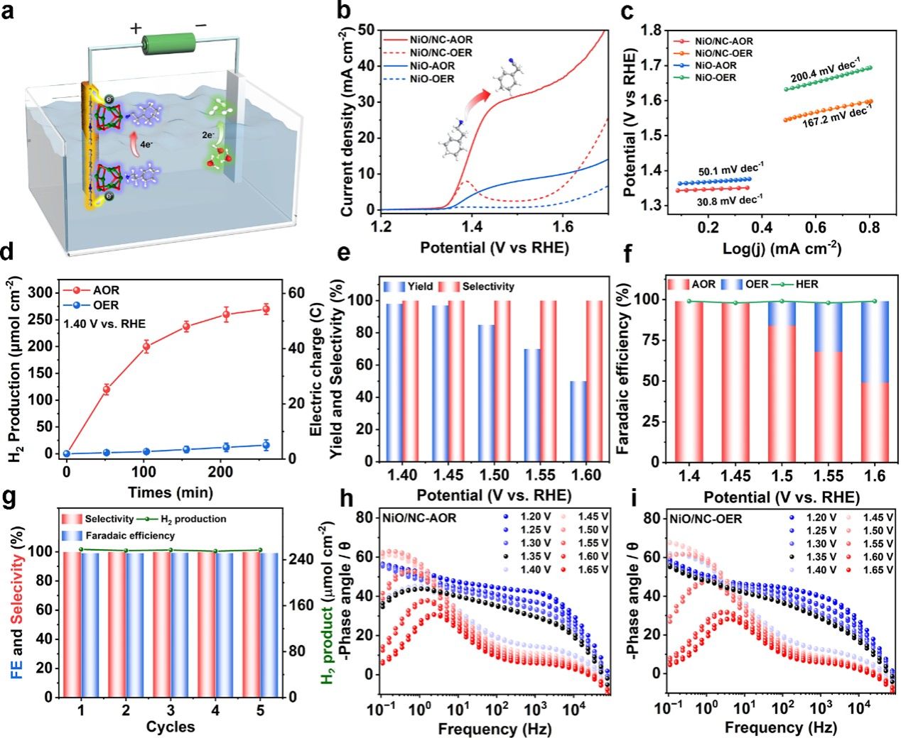 该研究工作构筑了阳极伯胺氧化与阴极产氢的全反应,以NiO/NC作为阳极催化剂,Pt片作为阴极,在1 M KOH中添加10 mM伯胺分子并进行了相关电化学性能测试。研究结果表明伯胺分子的引入可以显著降低阳极氧化电位,且在1.40 V vs. RHE电位下产氢量为270 µmol cm-2,是纯水分解的16倍。此外,伯胺转化率接近100%,腈的选择性和法拉第效率超过99%。原位电化学阻抗测试实验中,当施加电位为1.35 V vs. RHE时,伯胺分子的氧化在低频处有一个新峰,证明了在该电位下有电子交换反应发生,从而说明了伯胺氧化相对于析氧反应在动力学上也具有优势。