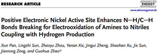 近日,我院赵国华教授团队发展了一种促进N-H/C-H键断裂以实现高效电解水制氢的方法。该方法通过制备具有正电子镍活性位点的氮掺杂碳负载NiO纳米粒子,实现了电氧化胺到腈的完全转化并达到99%以上的选择性,整个反应的起始电位低至1.32 V vs. RHE。原位表征和理论计算证明,氮碳基底增强了胺上N 2p轨道和Ni 3d轨道之间的相互作用,有利于间接氧化中间体R-CH2NH 2···NiO(OH)abs的构建,并促进后续的逐步脱氢过程。该全反应实现了阳极高附加值腈的高效制备,且阴极产氢是纯水分解的16.4倍,实现了资源和能源的双重利用。相关成果“Positive Electronic Nickel Active Site Enhances N-H/C-H bonds breaking for Electrooxidation of Amines to Nitriles Coupling with Hydrogen Production”发表于国际知名学术期刊《先进能源材料》(Advanced Energy Materials, 2024, 2400374)。