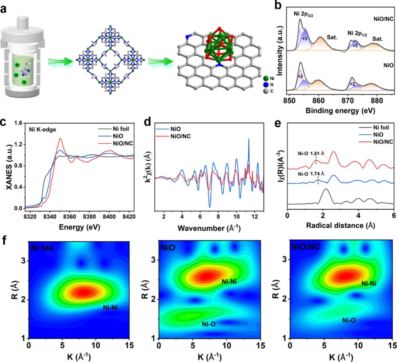 研究团队通过水热反应合成了基于Ni和二甲基咪唑的Ni-ZIF前驱体,在氩气保护进行低温退火处理,并在室温下进行氧化得到了氮碳负载的氧化镍材料NiO/NC。应用XPS和同步辐射对比NiO/NC和NiO上Ni的价态,研究人员发现NC基底的引入增加了Ni的化合价,说明NiO和NC基底之间存在电子相互作用。