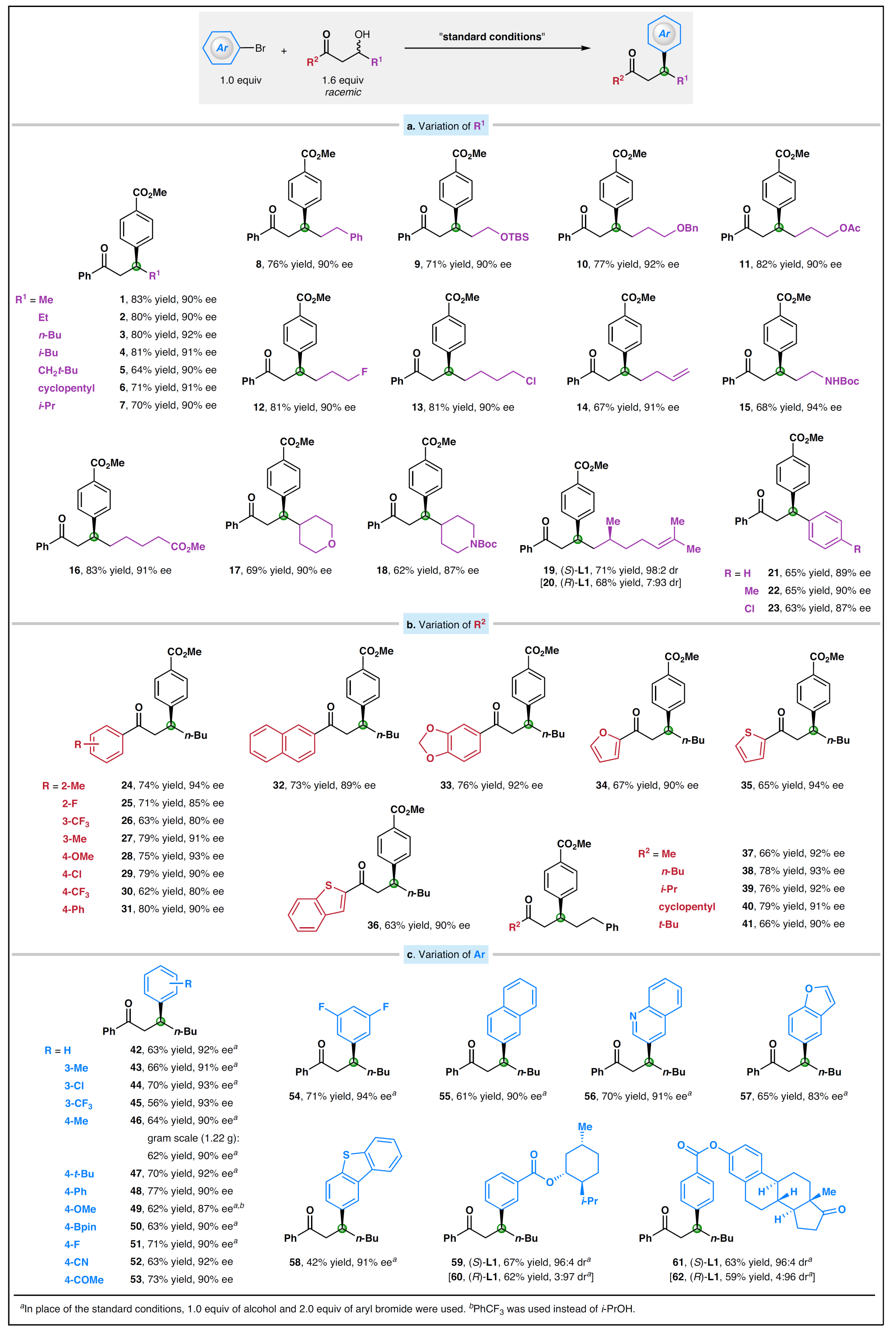 在最优条件下,反应具有良好的底物普适性和官能团耐受性。结果表明,羰基β-位置可以兼容不同大小的烷基取代基(包括新戊基、异丙基等),同时在多种官能团(包括硅醚、醚、酯、非活化一级烷基氟/氯、末端烯烃及Boc胺等)存在下反应良好。此外,芳基取代基同样适用于该反应。对于酮羰基上的R2基团,芳基与不同大小的烷基取代基都表现出良好的反应性和立体选择性。研究人员进一步评估了芳基溴化物的范围,不同位置富电子或缺电子取代基的芳基溴代物均被证明是有效的偶联伙伴。值得一提的是,对于带有立体中心的底物,手性催化剂控制了产物的立体化学。该研究工作发展了一种镍催化立体汇聚式脱氧还原偶联反应,可直接将易得的β-羟基酮转化为高附加值的手性β-芳基酮。