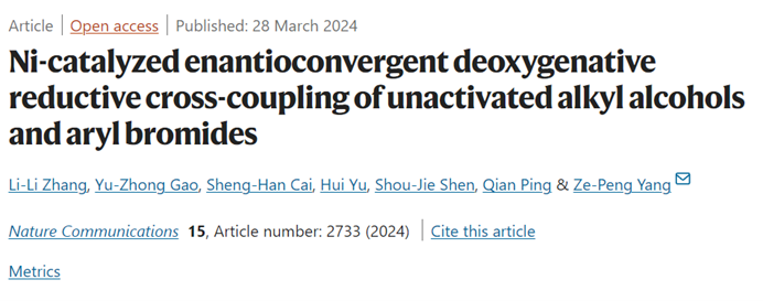 烷基醇是自然界中广泛存在的一类化合物,来源十分丰富。通过断裂醇的碳—氧键和芳基卤化物直接进行偶联能够快速获得高附加值化合物,然而碳—氧键的高解离能限制了烷基醇作为偶联试剂的应用。尽管近年来发展了若干策略来实现其参与的偶联反应,但不对称反应至今没有被深入研究。董哲及MacMillan团队发展了NHC(N-杂环卡宾)活化碳—氧键的策略(Nature 2021, 598, 451–456),我院杨泽鹏教授课题组借助该策略开展深入研究。近日,该课题组实现了一例非活化烷基醇(β-羟基酮)与芳基溴的立体汇聚式脱氧还原偶联反应,相关研究成果“Ni-catalyzed enantioconvergent deoxygenative reductive cross-coupling of unactivated alkyl alcohols and aryl bromides”在线发表于国际知名期刊《自然·通讯》(Nature Communications)。
