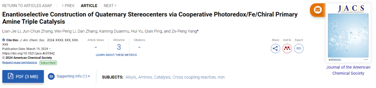 这项研究通过光氧化还原/铁/手性伯胺三重协同催化合成了一系列含有季碳手性中心的化合物,为该类化合物的精准构筑提供了一种新思路。杨泽鹏教授为论文通讯作者,博士研究生李连杰为第一作者。该研究工作得到了国家自然科学基金、科技部重点研发(青年)及永利集团青年百人计划的资助。