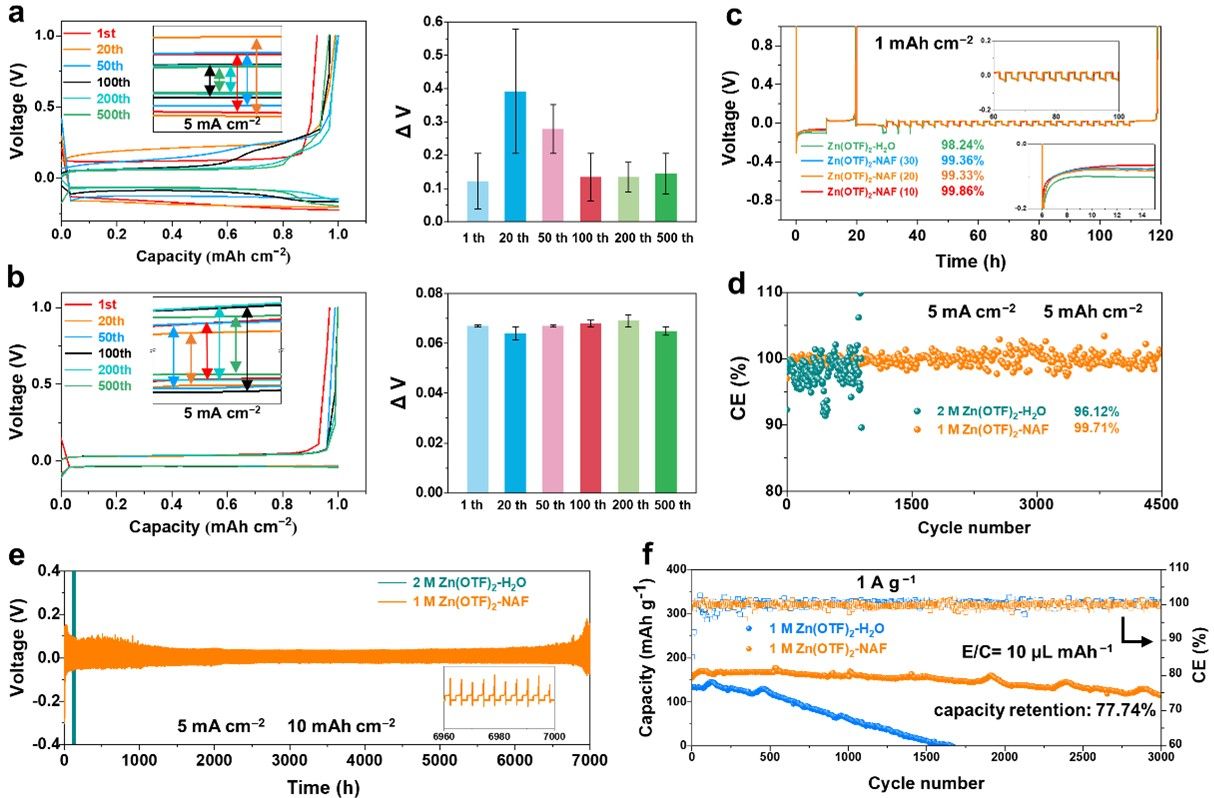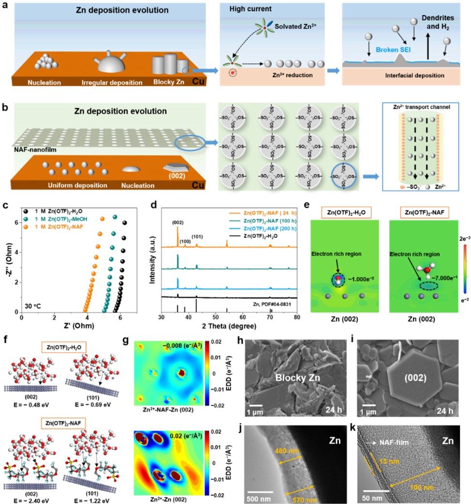 实验和理论计算表明,Nafion纳米膜引导锌离子沿着(002) 晶面沉积,减少了锌负极的产氢和腐蚀。