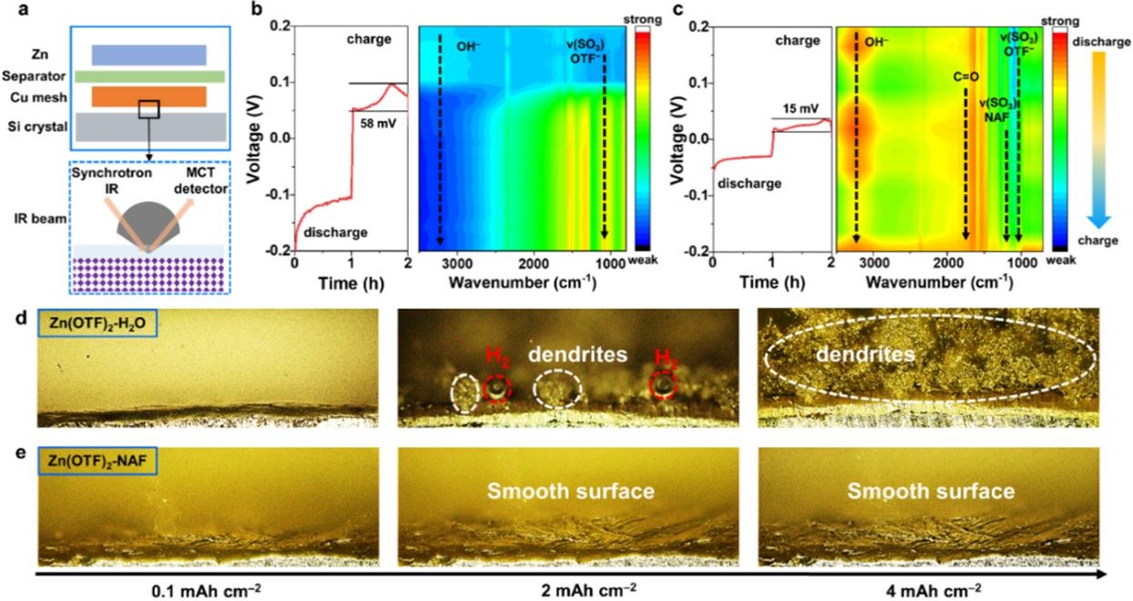 原位红外光谱和原位景深显微镜表征结果证明了在电极/电解液界面加速的锌离子去溶剂化过程提升了锌离子在负极的沉积/剥离效率。