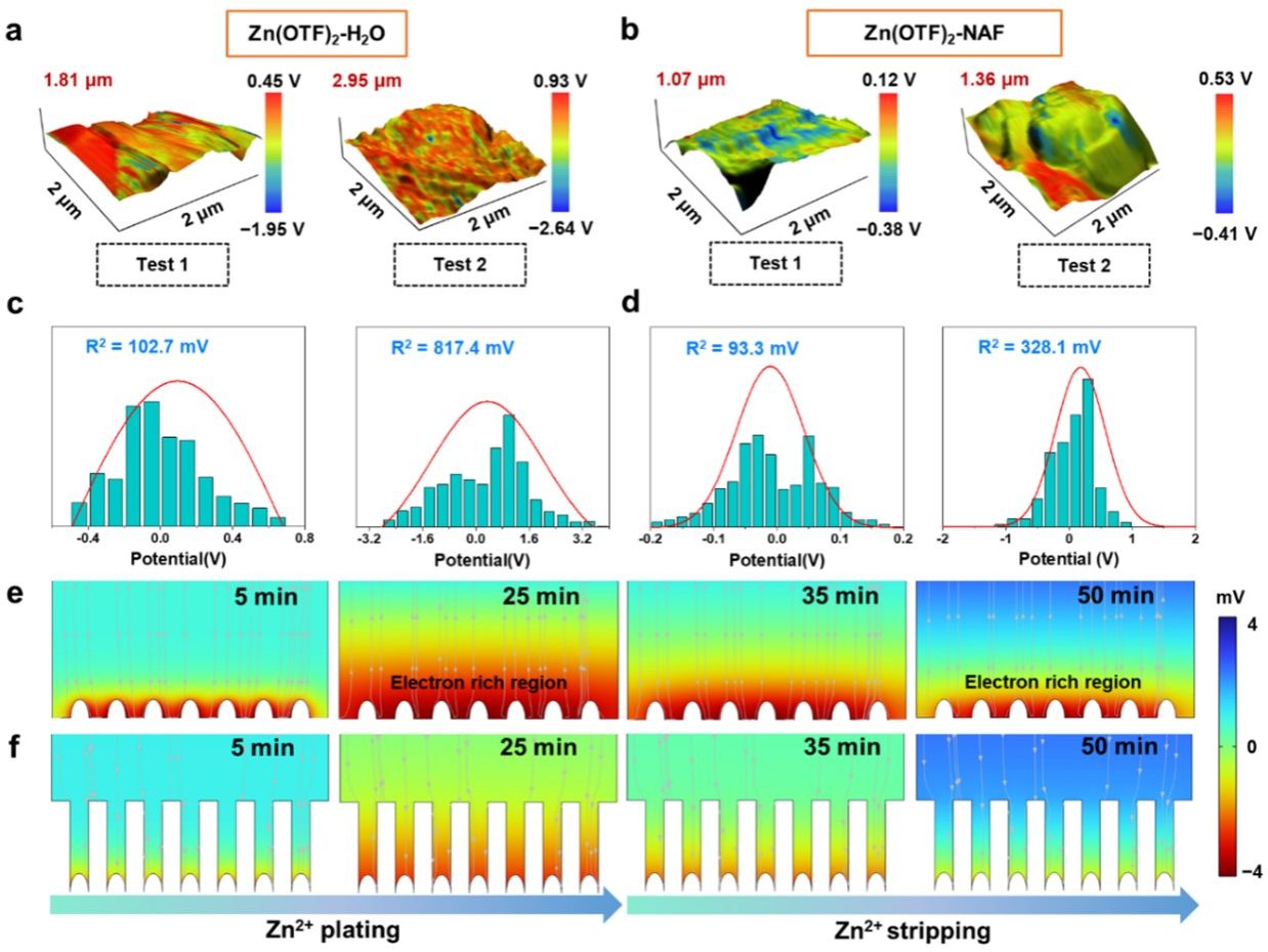 扫描探针显微镜和COMSOL物理场模拟证明,经过Nafion纳米膜修饰的锌负极具有更低的界面平均电势,从而防止锌离子优先沉积在尖端区域,形成更致密的SEI。