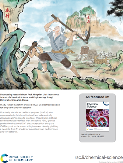 我院刘明贤教授团队近期设计了一种以全氟磺酸树脂 (Nafion) 为添加剂的新型电解液,其在锌负极上具有低吸附能(−2.09eV),在首次充电过程中原位形成Nafion纳米膜。这种具有亲锌基团(−SO3−)的超薄SEI即使在高电流密度下也能引导锌离子沿着成核能量更低的锌(002)晶面沉积,显著提高了锌离子沉积/剥离效率,获得无枝晶锌负极及长寿命锌离子电池。相关成果以“In-situ Nafion-nanofilm oriented (002) Zn electrodeposition for long-term zinc-ion batteries”为题发表于国际化学领域知名期刊《化学科学》(Chemical Science),并被遴选为期刊后封面文章(Back Cover)。封面以中国寓言故事“愚公移山”为背景,以太行、王屋二山代表锌负极在循环过程中的枝晶生长和寄生反应,移山过程代表Nafion纳米膜引导锌(002)晶面定向沉积实现长寿命锌离子电池。