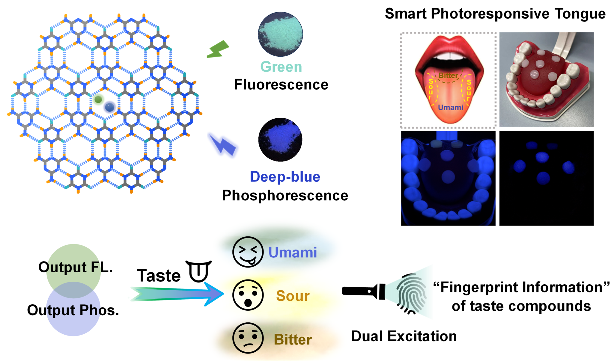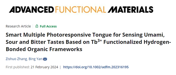 为了模仿人类味觉的感知过程,实现多种不同味觉的化合物的区分,我院闫冰教授团队近期通过将荧光和磷光信号结合,开发了一种具有多模式光响应的智能味觉传感器,可以有效识别出鲜味、酸味和苦味,相关研究成果以“Smart Multiple Photoresponsive Tongue for Sensing Umami, Sour and Bitter Tastes Based on Tb3+ Functionalized Hydrogen-Bonded Organic Frameworks”为题在线发表于国际知名期刊《先进功能材料》(Advanced Functional Materials, 2024, 34, 2316195)。