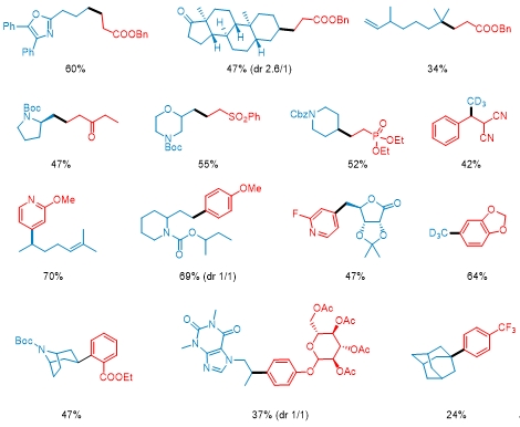 利用这种方法,可以方便的实现一级醇、二级醇、三级醇的烷基化和芳基化。反应体系可以兼容丰富的官能团以及杂环结构,同时能够实现对复杂天然产物和药物的后修饰以及关键中间体的高效合成。利用商业化的氘代甲醇亦可以实现烷基或芳基的氘代甲基化反应,在药物化学上具有一定的应用价值。