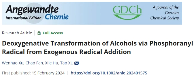 利用RO-C碳中心自由基β-断裂产生烷基自由基实现醇的脱氧偶联已有报道,但形成这种中间体需要昂贵的活化试剂,而通过RO-P膦中心自由基β-断裂产生烷基自由基有望提供一种高效活化醇脱氧偶联的方式。日前,我院徐涛教授课题组发展了一种基于外源自由基加成得到磷自由基中间体实现醇的直接脱氧转化的新方法,相关研究成果“Deoxygenative Transformation of Alcohols via Phosphoranyl Radical from Exogenous Radical Addition”在线发表于化学领域著名国际学术期刊《德国应用化学》(Angewandte Chemie International Edition, 2024,e202401575)。