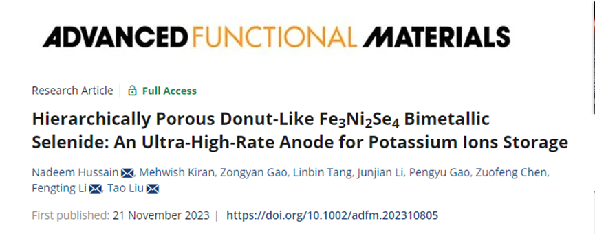 我院刘韬教授团队长期致力于新型锂电池的设计开发,近期首次通过一步无模板策略成功制备了分层多孔环状Fe3Ni2Se4(NFS),并研究了其作为磷酸钾电池新型负极材料的电化学性能。该策略消除了模板合成的复杂过程,切断了传统的中空结构合成,并巧妙地利用了Kirkendall效应,通过金属离子和非金属离子的非对称扩散构建了环状形态。分层多孔的环状结构提供了高比表面积和缩短的离子扩散路径,以加速氧化还原动力学,提高了速率性能和循环稳定性。因此,得到的NFS在可逆容量、倍率性和长循环方面均展现出优异的电化学性能。相关成果以“Hierarchically Porous Donut-Like Fe3Ni2Se4 Bimetallic Selenide: An Ultra-High-Rate Anode for Potassium Ions Storage”为题发表在国际权威期刊Advanced Functional Materials上。