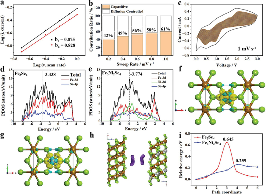 图5. a) 在不同阴/阳极峰值处的log(i)与log(V)图。b) 在不同扫速(0.2–1mV s−1)下电容过程的贡献。c) 在扫描速率为1 mV s−1下电容过程的贡献。计算得到的d)Fe3Se4的PDOSd) 和e)Fe3Ni2Se4的PDOS。f, g) 掺杂Ni之前和之后Fe3Ni2Se4的电荷密度差异(CDD)。黄色区域表示电子积累,而蓝色区域表示电子耗尽。h) 在Fe3Se4(112)和Fe3Ni2Se4(112)界面上K+的迁移示意图。i) K+在Fe3Se4(112)和Fe3Ni2Se4(112)界面上的迁移能垒