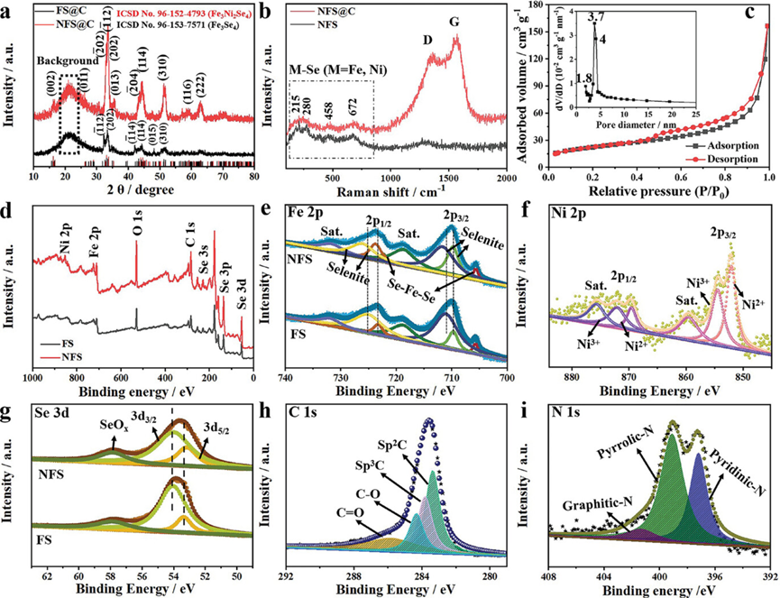 图2. a) Fe3Se4@C和Fe3Ni2Se4@C的XRD图谱。b) Fe3Ni2Se4和Fe3Ni2Se4@C的拉曼光谱。c) Fe3Ni2Se4@C的氮气吸附/脱附等温线及相应的孔径分布。d) Fe3Ni2Se4和Fe3Ni2Se4的XPS谱。Fe3Ni2Se4@C的e) Fe 2p,f) Ni 2p,g) Se 3d,h) C 1s,和i) N 1s的高分辨XPS谱