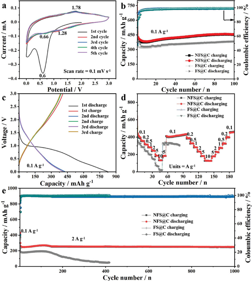 图3. a) 在0.1 mV s−1下的前五个循环的CV曲线。b) 在0.1 A g−1下Fe3Ni2Se4@C和Fe3Se4@C的循环性能。c) 在0.1 A g−1下Fe3Ni2Se4@C的前三个循环的充放电曲线。d) Fe3Ni2Se44@C和Fe3Se4@C的倍率性能。e) 在2 A g−1下Fe3Ni2Se4@C和Fe3Se4@C的长循环性能