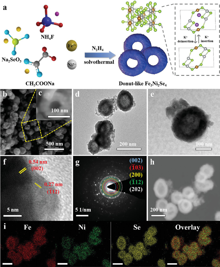 图1. a) 分层多孔环状Fe3Ni2Se4的合成过程的示意图。分层多孔环状Fe3Ni2Se4的b、c) SEM图像,d、e) TEM图像,f) 高分辨透TEM图像,g) SAED,h、i) HAADF-STEM图像,以及相应的元素Mapping。比例尺,200 nm