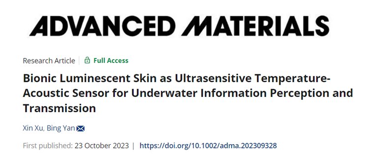 人工皮肤传感器(ASSs)是近年来的研究热点,其主要通过模拟生物皮肤的结构、功能和行为来感知外部刺激,包括温度、压力、振动、声音、汗液成分和pH,许多类型的刺激响应促使ASS被广泛应用于智能机器人、环境监测、可穿戴设备和智能医疗等领域。目前,多功能集成的ASS受到了广泛的关注,但用于温度声音传感的多功能集成ASS尚未报道,而大量已经报道的温度传感实验的灵敏度还有待提高,且所有报道过的声学传感器都仅仅是在空气介质中工作的。因此,开发超灵敏导电温度声学ASS,并实现其在非空气环境中的实际应用至关重要。我院闫冰教授团队长期聚焦致力于氢键有机框架材料(HOFs)的功能化研究,近期该团队将仿生学思想巧妙地融合于氢键有机框架基发光器件的制备与应用之中,制备出超灵敏的温度-声学光响应仿生皮肤传感器,并应用于水下信息识别与传输,相关成果以“Bionic luminescent skin as ultrasensitive temperature-acoustic sensor for underwater information perception and transmission”为题发表于化学、材料国际顶级期刊《先进材料》(Advanced Materials)上。