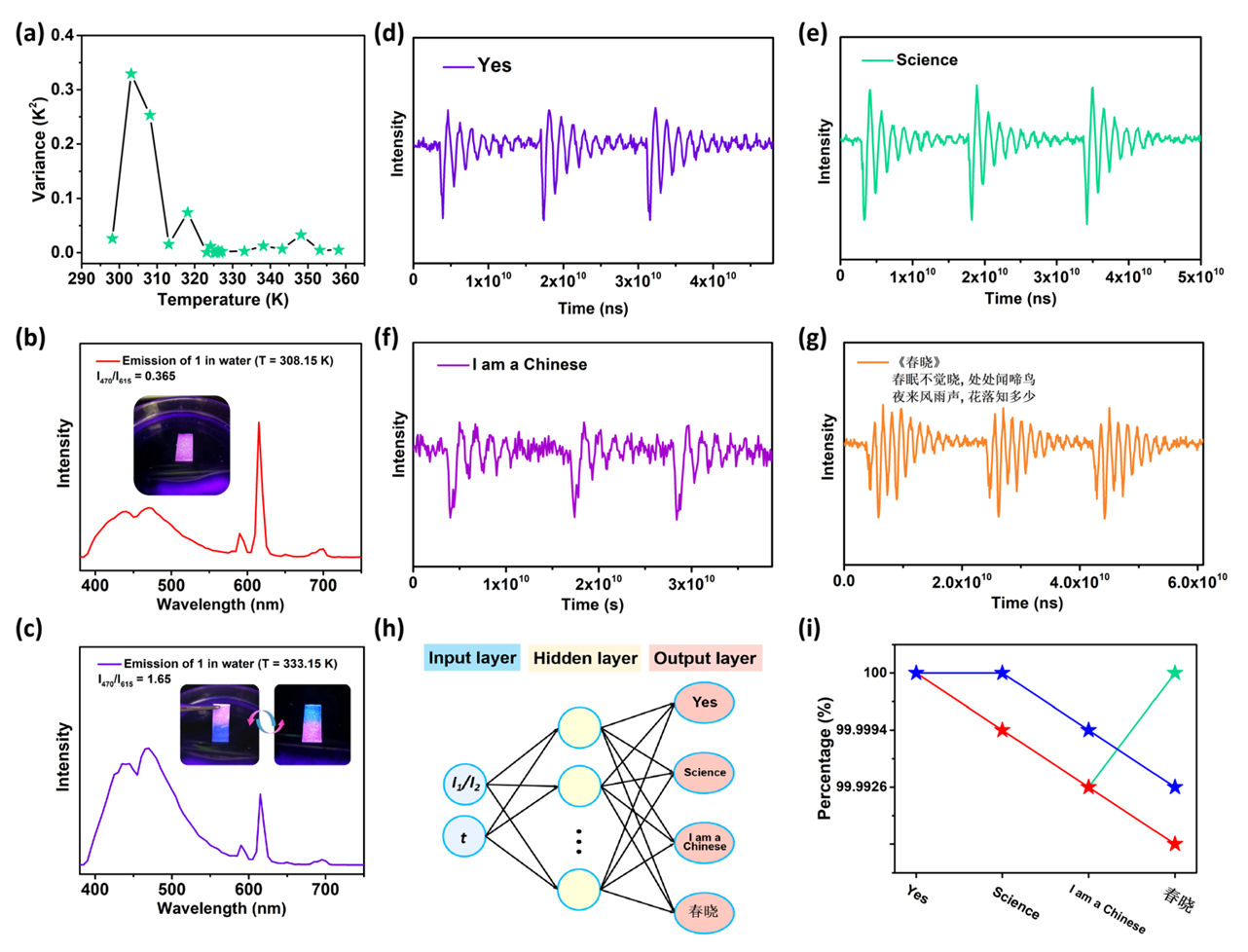 闫冰教授团队通过两步封装策略制备了一例Eu@HOF-TJ-1@TA L-skin (产品1)。产品1具有良好的柔性、溶液和结构的热稳定性以及双发射特性,可用作温度声学双功能传感器。研究人员详细分析探讨了产品1的温度响应机制,对于298.15−358.15 K的温度传感,该产品表现出超高的最大相对灵敏度(97.669% K−1)和超低的最低温度不确定度0.000952 K。课题组研究了产品1在空气和水中的声学传感性能,结果显示其在空气和水中的最大响应频率分别为400和300 Hz,在空气和水中的最大灵敏度分别为6593765.2和1346124.5 cps·Pa−1,在空气和水中的响应时间低至20 ms和10 ms。通过有限元模拟,研究人员模拟了产品1在空气中和水中的声音响应过程。为实现水下信息识别和传输应用,研究人员借助人工神经网络检测,发现产品1可以传感实际水温,并识别一出系列水声信息。