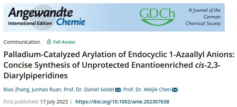 近日,我院陈伟杰研究员课题组与美国佛罗里达大学Daniel Seidel教授合作,基于有机合成中少有研究的环内1-氮杂烯丙基负离子中间体,通过钯催化芳基化反应实现了无保护顺式-2,3-二芳基哌啶化合物的快速合成,并实现了这一反应的不对称化。相关成果“Palladium-Catalyzed Arylation of Endocyclic 1-Azaallyl Anions: Concise Synthesis of Unprotected Enantioenriched cis-2,3-Diarylpiperidines”以Communication的形式在线发表于化学领域国际著名学术期刊《德国应用化学》(Angewandte Chemie International Edition, 2023, e202307638)。