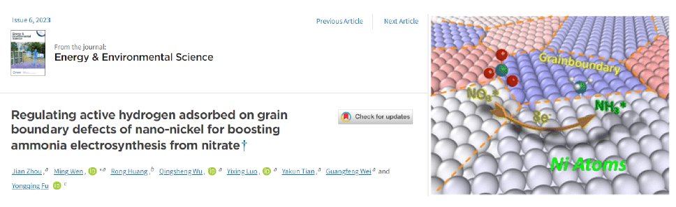 众所周知,氨的大规模合成依赖于高温高压高碳排放的传统Haber-Bosch反应。近年来,作为常温常压条件下可持续合成氨的一种有效途径,电化学硝酸根还原为氨反应(NitRR)的转化过程被视Haber-Bosch反应的一个有效补充而受到关注。该方法可以利用环境水体中的氮污染物之一的硝酸根为原料合成具有实际应用价值的氨。但是,目前所报道的研究中常采用析氢惰性的电催化材料来规避析氢竞争反应的影响,但难以达到理想的产氨速率。我院温鸣教授研究团队通过活性氢纳米镍的晶界调控,实现了硝酸根的高效电催化产氨。研究工作不仅解决了环境水体中的硝酸根污染问题,而且实现了常温常压无碳排放的电化学高效氨的可持续合成。相关成果以“Regulating active hydrogen adsorbed on grain boundary defects of nano-nickel for boosting ammonia electrosynthesis from nitrate” 为题近日在能源和环境领域顶级学术期刊《Energy & Environmental Science》(Energy & Environmental Science, 2023, 16, 2611-2620,IF: 39.714) 上发表。