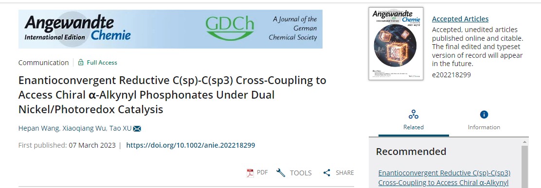 手性膦化合物在合成化学中有着重要作用,利用偶联策略可为其合成提供直接、便利、模块化的方法。尽管α-芳基、烯基、烷基膦化合物都已经有了相关报道,但是手性α-炔基膦酸酯尚缺乏高效合成途径。近日,我院徐涛教授课题组发展了一种光镍催化合成手性α-炔基膦酸酯的新方法,也是首次将光镍还原不对称偶联体系应用于C(sp)-C(sp3)成键,反应具有良好的底物普适性。相关成果“Enantioconvergent Reductive C(sp)-C(sp3) Cross-Coupling to Access Chiral α-Alkynyl Phosphonates Under Dual Nickel/Photoredox Catalysis” 在线发表于化学领域国际知名学术期刊《德国应用化学》(Angewandte Chemie International Edition, 2023, 62, e202218299)。