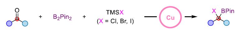有机硼化合物在现代有机化学中占有十分重要的地位,作为极其重要的合成子,该类化合物可以进行多种转化。α-卤代硼酸酯作为一类具有极大转化潜力的硼化合物,在有机合成和药物合成中具有重要的应用价值。现有合成三取代α-卤代硼酸酯的方法,往往需要强碱、极低温度以及对空气和水分敏感的有机金属试剂,限制了其应用范围。同时,目前对于四取代α-卤代硼酸酯以及手性α-卤代硼酸酯的合成还没有太好的方法。