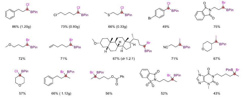 该反应不仅实现了三取代α-卤代硼酸酯的合成,对于传统方法中难以获得的四取代α-卤代硼酸酯也可以通过该策略轻易地合成,并且对各类官能团如醚、酯、酮、酰胺、烯烃、氰基、氟、氯、溴、硫、三氟甲基等均有很好的兼容性。此外,温和的反应条件也使得该方法用于复杂分子的后期修饰成为可能。
