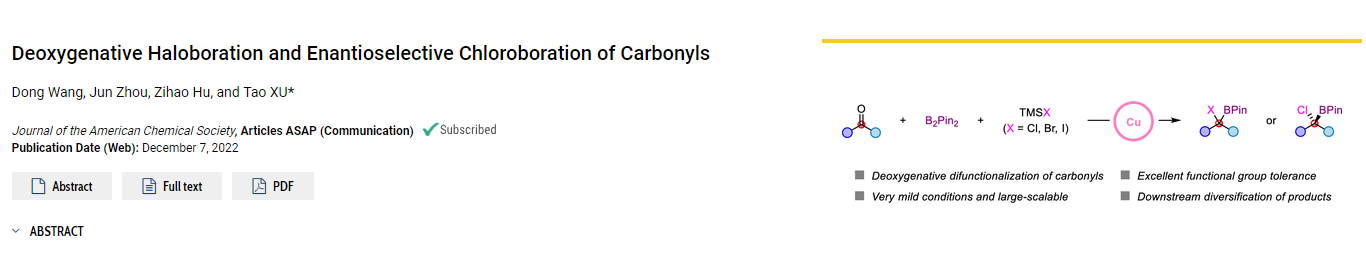 近日,我院徐涛教授课题组提出了羰基去氧双官能团化(DODC)策略,实现了醛的去氧烷硼化(Angew. Chem., Int. Ed. 2022, e202214213)及去氧芳硼化反应(ACS Catal. 2022, 12, 14926)。为了解决α-卤代硼酸酯的合成难题,其课题组进一步借助DODC策略,利用广泛存在或者合成易得的醛、酮作为反应前体,实现了α-卤代硼酸酯和手性α-氯代硼酸酯的高效合成。相关成果“Deoxygenative Haloboration and Enantioselective Chloroboration of Carbonyls” 在线发表于化学领域国际知名学术期刊《美国化学会志》(Journal of the American Chemical Society)上。
