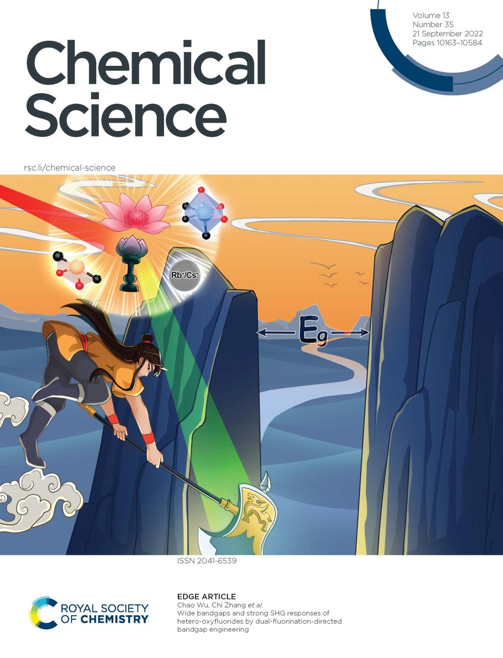 欧洲科学院院士、我院院长张弛教授研究团队以碘酸盐为研究对象,提出了一种双氟化调控能带结构的分子设计策略,创制了首例5d0过渡金属氟碘酸盐的晶体材料A2WO2F3(IO2F2) (A = Rb (RWOFI), Cs (CWOFI))。RWOFI和CWOFI表现出迄今为止在d0过渡金属碘酸盐体系中最宽的带隙,同时还具有强的倍频响应和宽光学透明窗口。相关成果“Wide bandgaps and strong SHG responses of hetero-oxyfluorides by dual-fluorination-directed bandgap engineering” (基于双氟化导向能带工程在杂氧氟化物中实现宽带隙和强倍频响应)日前以Edge Article的形式发表于化学领域权威学术期刊《化学科学》(Chem. Sci. 2022, 13(35), 10260-10266),并被Chemical Science编辑委员会遴选为期刊的封面文章。该封面以中国传说“沉香劈山救母”为背景,宝莲灯象征创制的晶态材料,在两种具有二阶姜−泰勒畸变的氟氧阴离子作用下,给予沉香巨大的能量,使沉香在华山上劈开了宽阔的裂缝。该裂缝代表晶体的宽的光学带隙。封面内容生动形象地展示了该工作中应用双氟化导向带隙工程策略使合成的杂氧氟化物实现了宽带隙和强倍频效应的同步增益。