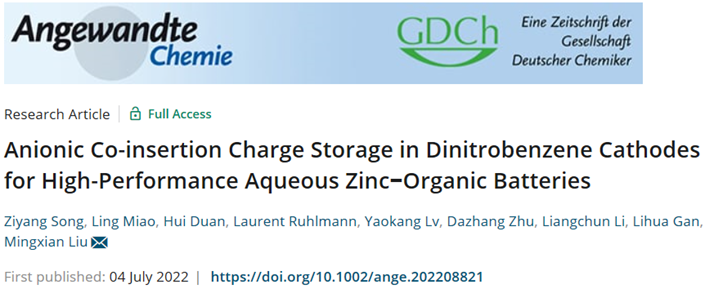 近日,我院刘明贤教授研究团队报道了二硝基苯作为锌-有机电池阴极材料,揭示了硝基芳烃阴极中阴离子共嵌插电荷存储机制,促进硝基位点的高效利用和低反应能垒的快速氧化还原速率,实现了水系锌-有机电池高比容量和长循环寿命协同输出。相关成果“Anionic Co-insertion Charge Storage in Dinitrobenzene Cathodes for High-Performance Aqueous Zinc−Organic Batteries”以Research Article的形式在线发表于化学领域著名的国际学术期刊《德国应用化学》(Angewandte Chemie International Edition, 2022, https://doi.org/10.1002/anie.202208821)。