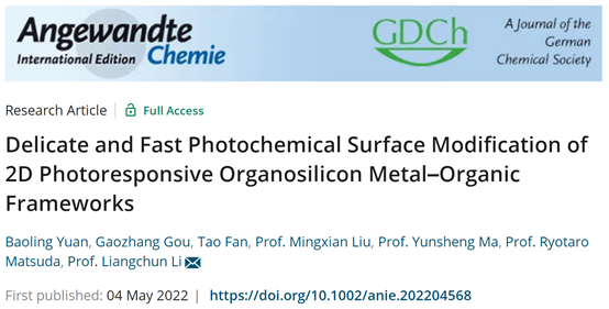 我院李良春教授课题组致力于把有机硅与MOFs材料相融合,开展交叉研究。近日,该课题组的相关研究成果以Delicate and Fast Photochemical Surface Modification of 2D Photoresponsive Organosilicon Metal–Organic Frameworks为题发表在国际知名期刊《德国应用化学》(Angewandte Chemie International Edition)上。