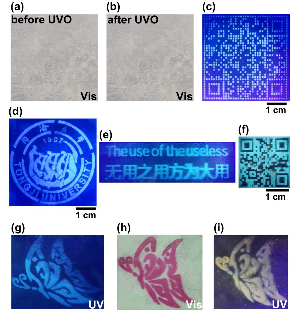 该课题组发展了以金属锌板为金属源制备高质量MOF膜的便捷方法,经过12小时的温和反应可在金属锌板上制备其MOF膜Zn-TSiMOF。在常用的紫外杀菌灯(含185和254 nm光)照射下,透过各种模板,数分钟内可在Zn-TSiMOF膜上产生具有良好分辨率、发蓝色荧光且亲水的图案,包括英文、汉字、校徽以及二维码等,这些信息和图案只有在紫外灯照射下肉眼可见,因而可以实现各种隐形信息的快速“荧光印刷”。此外,利用光刻蚀后的区域由超疏水转变成了亲水的性质,将光照后的Zn-TSiMOF膜浸没在罗丹明6G的水溶液中,即可染色得到日光下显示为玫瑰红色而在紫外灯下为黄绿色荧光的图案,为光响应材料在快速解密和二次加密方面提供了新的手段。