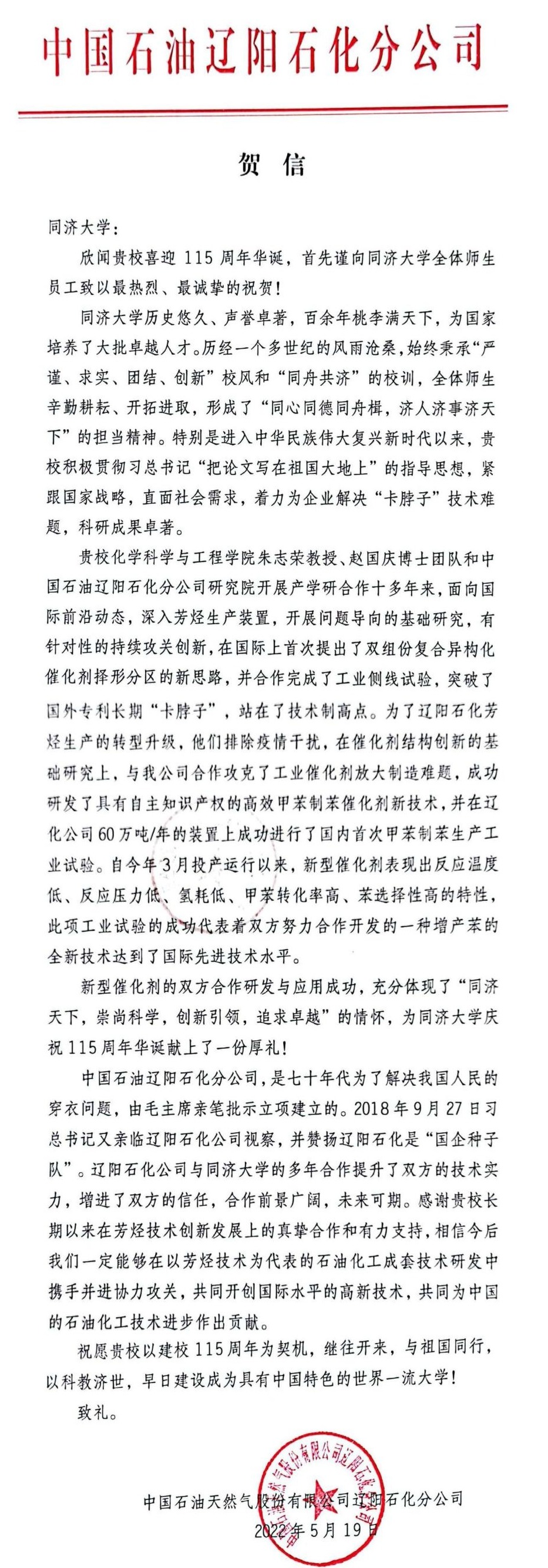 在永利集团115周年校庆日将临之际,我校yl9193永利集团收到中国石油天然气股份有限公司辽阳石化分公司发来的贺信。