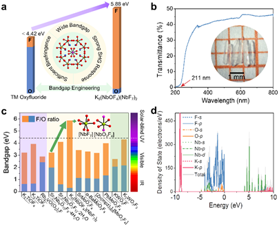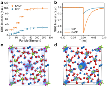张弛研究团队通过单晶X射线衍射结构分析,揭示了KNOF分子结构中富极氟阴离子的[NbO2F4]和[NbF7]金属铌中心多面体对材料线性和二阶非线性光学性能的影响机制。氟阴离子充当了化学“剪刀”,使得结构由一维的[NbO2F4]∞链和分离的[NbF7]多面体构成,进而有效地降低了结构的维度。受到二阶姜-泰勒效应的影响,铌阳离子形成了部分氟化的[NbO2F4]八面体和完全氟化的[NbF7]多面体。这些畸变的多面体沿着c轴一致对齐排列,有利于产生大的倍频效应。在铌中心多面体中,增加氟氧比例,可以抑制以氧2p电子轨道为主的价带顶部向高能量处移动。KNOF中的氟氧比远高于其它过渡金属氧氟化物,这种富氟环境不仅削弱了[NbO2F4]基团中铌阳离子与氧之间的相互作用,而且也促使结构形成有序且完全氟化的[NbF7]基团,这两种富氟基团都拓宽了紫外光的透明范围。研究团队还进一步运用第一性原理理论模拟计算,深入探讨并阐明了KNOF可同时实现强倍频效应和宽带隙的内在物理机制,阐释了强倍频效应主要原因是高度扭曲的部分氟化[NbO2F4]和完全氟化[NbF7F4]多面体的有序排列,而宽带隙来源于材料结构中高度氟化的过渡金属中心多面体。该无机晶体KNOF兼具宽的光学带隙(5.88 eV, 对应于紫外吸收截止边211 nm日盲紫外区)和强的倍频响应(4.0 × KH2PO4 @ 1064 nm),以及适中的双折射率(0.07 @ 546 nm)。该研究为探索短波紫外透过的二阶非线性光学晶体材料提供了一种新的研究设计思路。