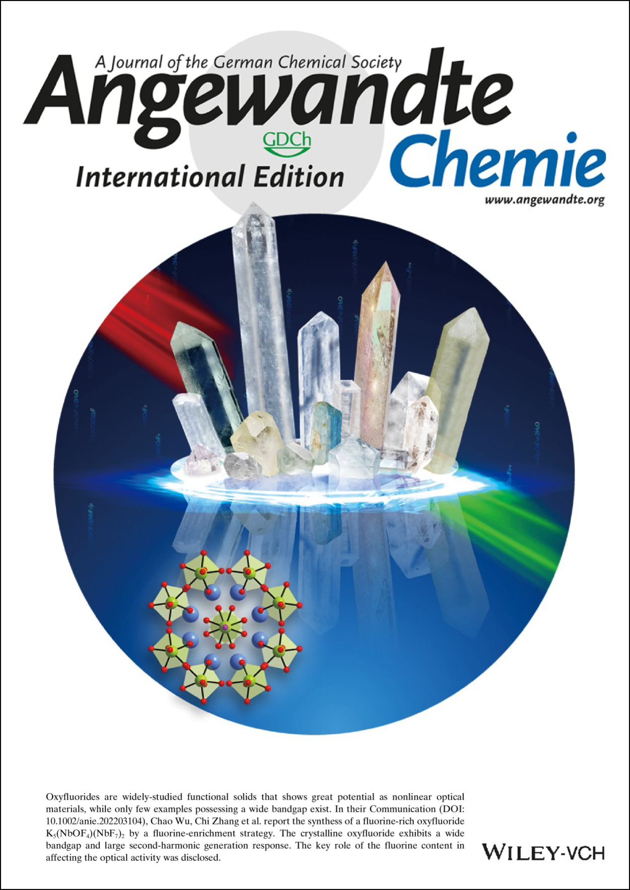 我院张弛院士研究团队以氧氟化物为研究对象,提出了一种富集高电负性氟阴离子调控能带结构的分子设计策略,设计创制了一例具有宽带隙和强倍频响应的日盲紫外非线性光学晶体材料K5(NbOF4)(NbF7)2 (KNOF)。相关成果“Ultrawide Bandgap and Outstanding Second-Harmonic Generation Response by a Fluorine Enrichment Strategy at a Transition-Metal Oxyfluoride Nonlinear Optical Material” (过渡金属氟氧化物非线性光学材料实现了超宽能带和强的二次谐波响应)5月17日以通讯形式发表于国际化学权威学术期刊《德国应用化学》(Angew. Chem. Int. Ed., 2022, e202203104),并被Angewandte Chemie编辑委员会遴选为期刊的封面文章(Angew. Chem. Int. Ed., 2022, e202206423)。