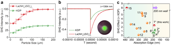 日前,张弛院士研究团队还以非π-共轭硫酸盐为研究对象,提出了一种复合阳离子盐策略,构建了一例具有强倍频效应的稀土基硫酸盐深紫外二阶非线性光学晶态材料。相关成果“A Lanthanum Ammonium Sulfate Double Salt with a Strong SHG Response and Wide Deep-UV Transparency”(一种具有强倍频响应和宽深紫外透过的硫酸镧铵复合盐)日前以通讯形式在线发表于《德国应用化学》(Angew. Chem. Int. Ed., 2022, 61(6), e202115855)。