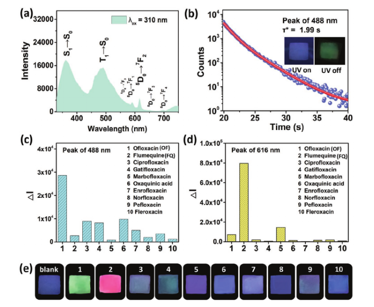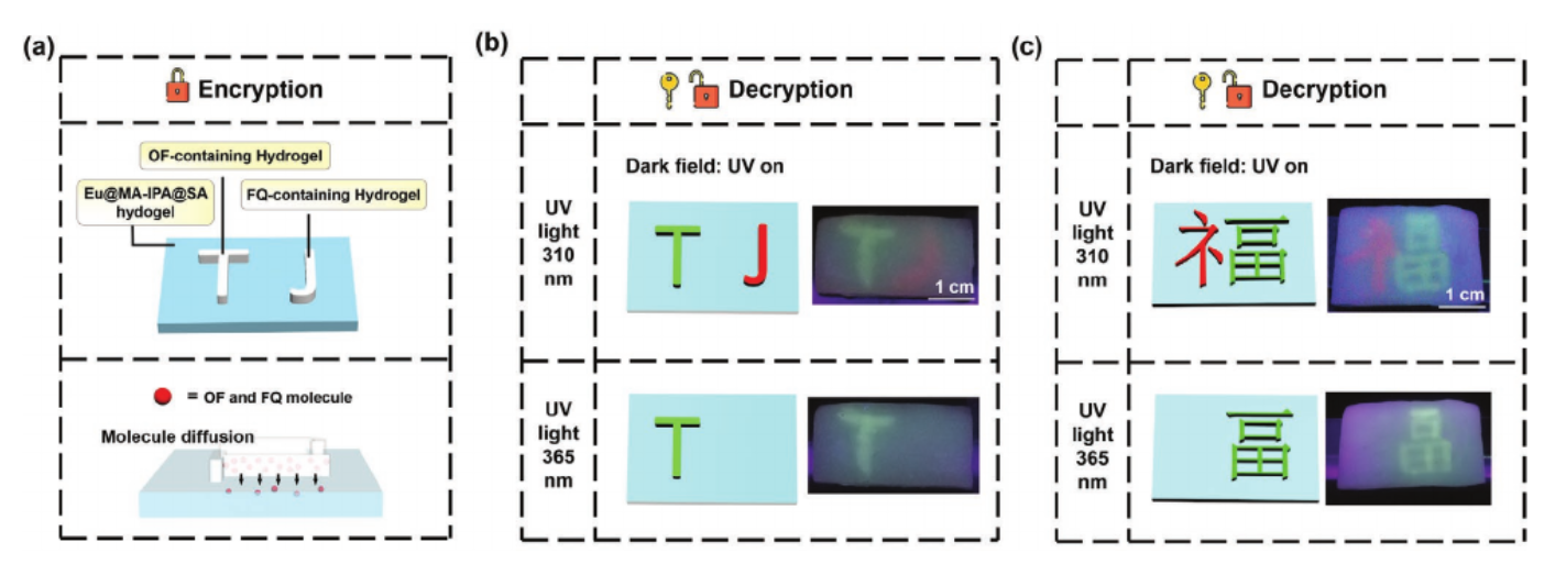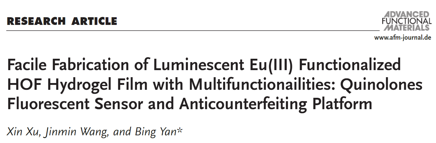我校yl9193永利集团闫冰教授课题组在多年开展金属有机框架功能化组装稀土光功能杂化材料研究的基础上,逐渐拓展至非金属的有机框架晶态基元杂化材料的构筑及功能化。比如,在共价有机框架材料的后合成功能化方面取得了系列进展(J. M. Wang, B. Yan*, et al., Inorg. Chem. 2019, 58, 9956-9963; Anal. Chem. 2019, 91, 13183-13190; ACS Appl. Mater. Interface 2020, 12, 12990-12998; Anal. Chem. 2021, 93, 4308-4316; J. Mater. Chem. C 2021, accepted)。近期,课题组以氢键有机框架材料为功能化对象,制备了一种铕离子功能化的氢键有机框架水凝胶薄膜,该薄膜具有长达1.99秒的长余辉,可用于两种喹诺酮(氧氟沙星和氟甲喹)的荧光检测,并且可以通过利用对两种喹诺酮独特的荧光响应实现信息的加密、解密和解码。相关研究成果在线发表于国际知名期刊Advanced Functional Materials (IF = 16.836) (DOI: 10.1002/adfm.202103321).