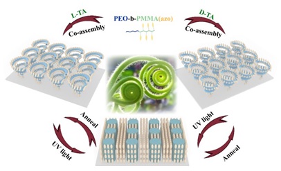 在紫外光照射下,由于液晶基元中偶氮苯基团从反式转变成顺式的异构体,破坏了连续项PMMA(azo)的液晶特征,导致3D螺环结构被退去。当将顺式偶氮苯退火返回到反式偶氮苯时,手性液晶性能重新恢复,薄膜的螺旋结构又再次出现。这种可控的自组装是一种制备可逆手性3D螺环结构的有效策略,为开发先进的手性密码学材料开辟了一条新途径。该项研究工作得到国家自然科学基金项目的资助。