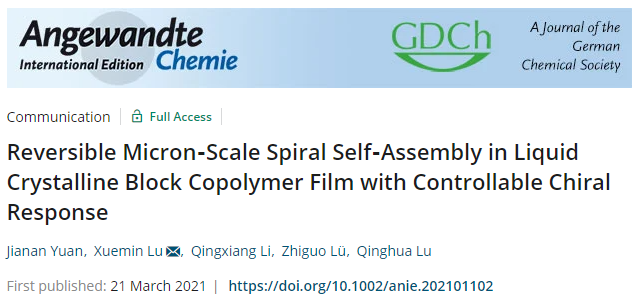 我院博士研究生袁嘉男在路庆华教授指导下,将外源性手性分子掺杂液晶嵌段共聚物复合膜,然后进行热退火处理的相分离,成功地构筑了一种微米尺寸的手性三维立体(3D)螺环结构,这种手性3D螺环结构可以在紫外光照射下被擦除,热退火后可再次重新形成,有望实现手性结构的信息存储。日前,相关研究成果发表于国际知名化学期刊Angewandte Chemie International Edition (doi: 10.1002/anie.202101102)。
