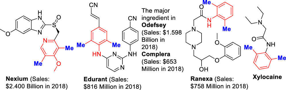 甲基是小分子药物里面非常常见的基团,它可以改变分子的构象,改善药物的溶解性,增强代谢稳定性以及生物活性等,这种效应被称为“甲基效应”。因为“甲基效应”的存在,发展高效的甲基化反应以及绿色甲基化试剂成是有机合成化学的重要目标。在含有甲基的药物分子中,2,6-二甲基取代芳烃是常见的结构,在2018年销售额前200的小分子药物里面就有六种药物的有效成分含有该结构。