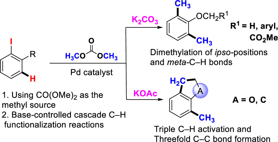 我院张扬会课题组一直致力于研究碳,碳-环钯配合物的有机反应。碳,碳-环钯配合物具有特殊的结构和独特的反应活性,可以用来发展新颖并且有实用价值的有机反应。最近,该课题组报道了基于碳,碳-环钯配合物的高效芳烃甲基化反应。该反应使用环境友好的碳酸二甲酯为甲基源,在钯催化下,实现了2-碘苯甲醚衍生物在碘原子的原位以及间位的甲基化。碳酸二甲酯价格低廉,使用方便,且不产生有害化学废物,是理想的甲基化试剂,该反应是首次在偶联反应以及C─H键甲基化反应中使用碳酸二甲酯作为甲基源。非常有意义的是,反应中可以使用无机碱调控产物的形成:碳酸钾做碱,得到的2,6-二甲基苯甲醚;醋酸钾做碱,得到的则是甲基取代的2,3-二氢苯并呋喃。反应中涉及到多重C(sp3)─H键活化,并形成多根C─C键,特别是C(sp3)─H键的偶联,是一类新颖的串联反应。