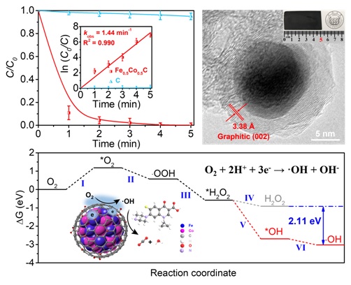 赵国华教授、赵红颖教授团队在研究工作中,提出了电催化还原分子氧产生∙OH的新方法。构筑具有碳层包覆合金结构的一体化铁钴碳气凝胶(FeCoC)阴极,该电极具有高比表面积、高空间利用率、高导电性、且易直接成型等优异电化学性能。研究表明,电催化还原分子氧的活性位点位于石墨碳层表面,首先发生两电子电催化氧还原产生H2O2,进而H2O2单电子电催化还原产生∙OH。通过原位气压测试验证了整个分子氧还原为电化学过程,表观电子转移数为3.1。不同于传统芬顿反应,整个分子氧还原为电催化过程,电催化活性位点在石墨碳层表面,铁钴合金被保护在碳层内部,不仅避免与外界溶液接触反应,无金属离子溶出,不产生铁泥;还克服了传统芬顿反应Fe(II)/Fe(III)价态循环慢的速率控制。在。将该电催化还原分子氧能在宽pH3-11)范围保持HO的高产生效率。将该方法应用于有机污染物的降解,5 min内可完全降解污染物,且电极循环稳定性优异,具有良好的应用前景。同时,通过X射线吸收近边结构光谱、近边X射线吸收精细结构光谱、电子顺磁共振波谱、原位气压法、线性扫描伏安法以及密度泛函理论计算对电催化还原分子氧选择性产生∙OH的分子机理进行了深入探究。该工作提出的界面电子调控选择性电催化还原分子氧产生∙OH理论体系,为有毒有害有机污染物的绿色、高效氧化降解新方法的研究和应用提供了重要的理论基础,拓展了环境水处理技术。