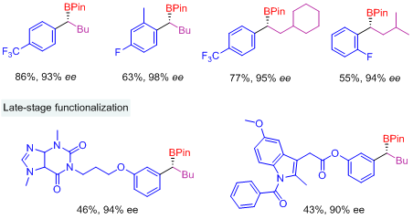 该课题组研究人员将可见光/镍协同催化策略用于不对称还原偶联反应中,实现了传统还原偶联体系条件下无法实现的α-氯代烷基硼化合物的不对称芳基化,合成一系列具有高光学活性的苄基硼酸酯类化合物。相比与传统偶联反应,该方法有效地避免了有机金属试剂的使用,在底物的选择上更加灵活,实用性更高。该方法更重要的特点是可以用于天然产物衍生物的后期修饰并保持优秀的立体选择性。