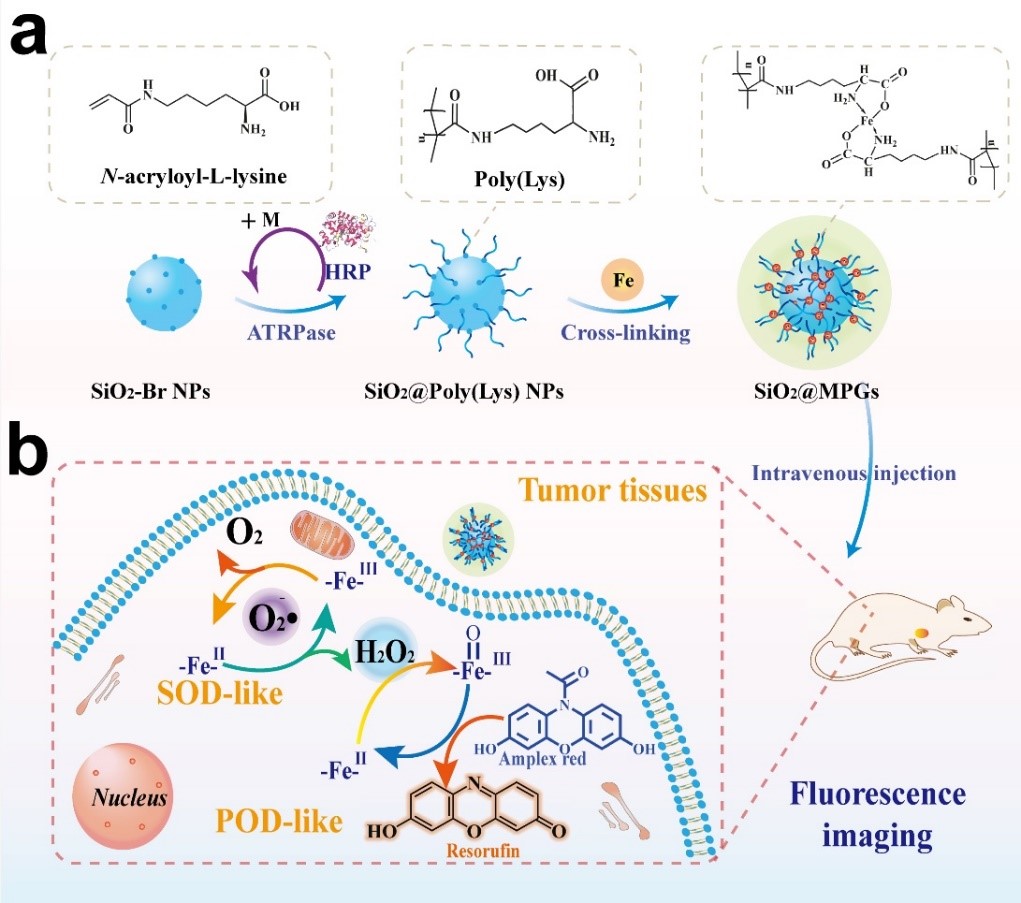 王启刚团队仿生制备“人工多酶”,实现安全高效的肿瘤成像 相关成果发表于《德国应用化学》 常见的纳米酶大多数是金属化合物纳米颗粒,其催化活性主要是来自在纳米颗粒表面的金属离子。在自然界中,生物酶的特征表明活性位点和支持、稳定活性位点的网络环境对于高催化效率同样重要。通过调整活性位点的成分和环境可以实现高的活性和选择性。水凝胶是一类具有良好生物相容性的三维亲水网络材料,其结构可以有效地保护酶分子活性中心,同时提供更好的底物迁移微环境,从而实现有效的催化作用,载酶水凝胶材料已成为生物学研究中的热点。纳米凝胶为水凝胶的纳米粒子,具有类似于宏观水凝胶材料的亲水网络及类似流体的传输特性,其纳米的尺寸可以作为进一步体内生物应用的理想载体。在受限的纳米空间中实现修饰或组装以获得杂化纳米凝胶仍然存在挑战。 应对这一挑战,yl9193永利集团王启刚团队从仿生的角度出发,设计了一种酶催化的原子转移自由基聚合(ATRPase)和金属配位交联方法成功制备出纳米人工多酶凝胶体系。该体系具有模拟超氧化物歧化酶(SOD-like)和过氧化物酶(POD-like)特性,可以实现肿瘤微环境级联催化的响应成像。日前,相关研究成果以“Multienzyme‐Mimic Nanogels Synthesized by Biocatalytic ATRP and Metal Coordination for Bioresponsive Fluorescence Imaging”为题,发表在国际著名学术期刊Angewandte Chemie International Edition(《德国应用化学》)上。yl9193永利集团为该文的唯一通讯作者单位,硕士生齐美园为第一作者,王霞副教授和王启刚教授为共同通讯作者。 研究人员首先在纳米粒子表面修饰酶催化的原子转移自由基聚合的引发剂(-Br),以具有良好生物相容性的生物酶为催化剂,修饰有双键的赖氨酸(N-acryloyl-L-lysine)为聚合单体,在纳米粒子周围聚合制备得到聚赖氨酸高分子刷,最后通过亚铁配位交联,从而构建出具有多酶活性的人工多酶凝胶体系(如图1所示)。凝胶体系中高分散的Fe离子一方面作为凝胶网络的交联剂,同时作为模拟酶的活性中心。通过模拟SOD和POD酶,先将肿瘤部位高水平的O2•−催化转化为H2O2,进一步基于肿瘤部位提升的H2O2通过级联酶催化反应实现肿瘤微环境响应的安全、高效的肿瘤成像。该人工多酶凝胶体系类似自然的过氧化物酶催化机制不产生羟基自由基,具有低毒性和高生物安全性。同时,ATRPase方法和金属配位交联技术可进一步实现多种纳米材料体系的制备,用于药物输送和其他生物医学应用。