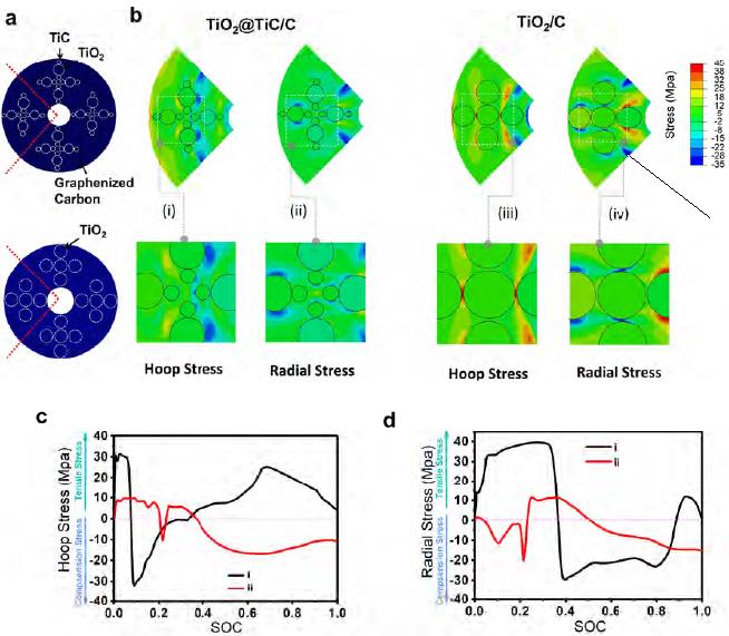 课题组随后将研究体系拓展到复合电极材料,提出了多组分材料的界面应力缓解策略。比如,课题组设计了室温下二维Ti3C2MXene材料的原位转化反应,成功地一步合成了具有三明治结构的二元Na0.23TiO2纳米带/Ti3C2纳米片复合物;该三明治结构复合物作为锂离子/钠离子电池的负极材料时,表现出优异的循环稳定性和倍率性能。通过机理分析发现,一维Na0.23TiO2纳米带原位生长在二维Ti3C2纳米片上的三明治复合结构,不仅可以促进载流子在复合材料界面的传输,还能有效缓解活性材料在循环过程中的体积膨胀和结构应力,从而实现了优异的电化学性能。该研究工作发表在《Nano Energy》上(Nano Energy, 2018, 46, 20-28;影响因子12.34)。课题组硕士研究生黄继梅是第一作者。 课题组还通过表面活性剂模板法合成了具有有序孔道的TiO2@C复合膜,并进一步利用原位碳热还原反应在TiO2与C界面引入导电良好但锂电惰性的TiC纳米点,制备了三元TiO2/TiC@C有序介孔复合膜材料。该复合膜可弯折、可转移、可裁剪、可放大,具有优异的可加工性。该三元复合膜用作锂电池负极材料时,较二元TiO2@C复合膜展现出更出色的长循环稳定性和高功率特性。同步辐射、电化学动力学、力学模拟等多种研究手段表明,TiC的存在不仅能促进复合膜材料的界面电荷传输,还大大缓解了材料界面的环向拉应力和径向拉应力,赋予了电极高结构稳定性。该研究工作日前已经在Cell Press旗下的《iScience》上(DOI:https://doi.org/10.1016/j.isci.2018.04.009),课题组博士研究生祖连海是共同第一作者。